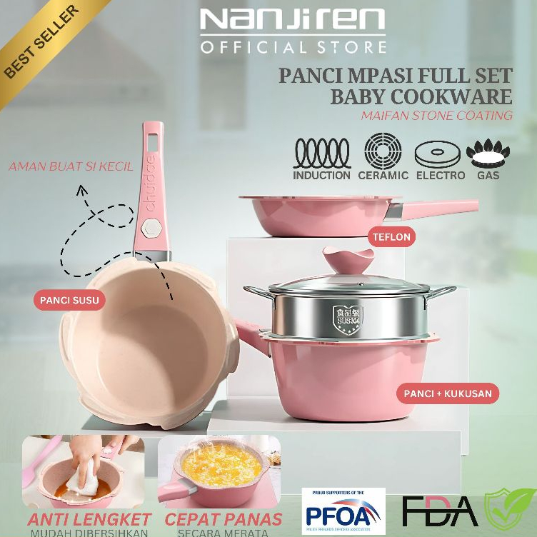Ini yang paling penting! Kita gak mau kan kasih makanan yang tercemar bahan kimia berbahaya ke si kecil? Nanjiren Panci MPASI Baby Cook ini terbuat dari bahan premium yang aman untuk makanan bayi. Bebas PFOA, PTFE, dan bahan berbahaya lainnya. Jadi, kamu bisa masak dengan tenang, tanpa khawatir si kecil keracunan.