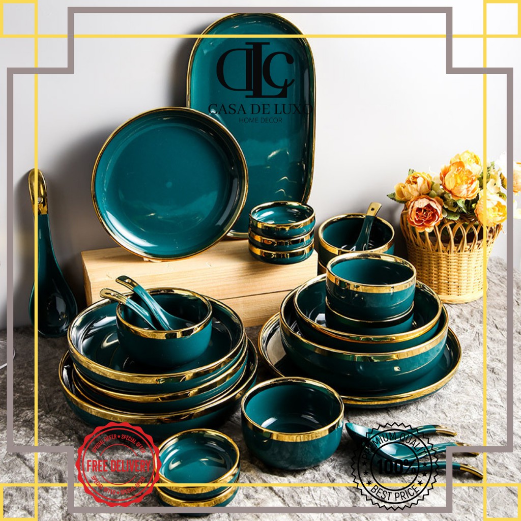 Piring & Mangkuk Keramik Hijau Emerald Gold Elegan: Mewah dan Terjangkau!