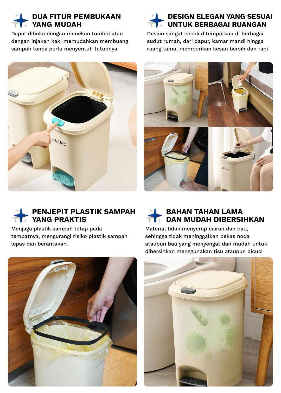 - Nggak berisik: Pilih yang mekanisme injaknya halus dan nggak berisik saat dibuka atau ditutup. Kita kan mau tidur nyenyak, bukan malah kebangun gara-gara suara tempat sampah.